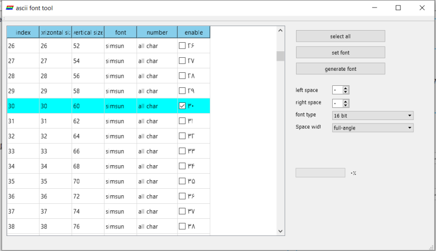 بعد از ان سایز فونت را باید انتخاب کنیم تا فونت با ان سایز برای ما تولید شود،ما به همه سایزهای نیاز نداریم و سایزی که برای ما مناسب است،سایز 30 است،پس فقط ان را enable میکنیم.