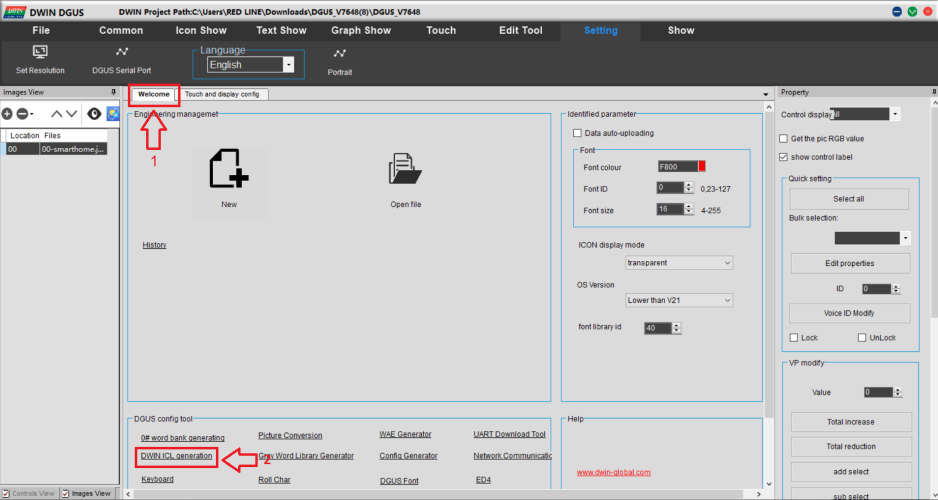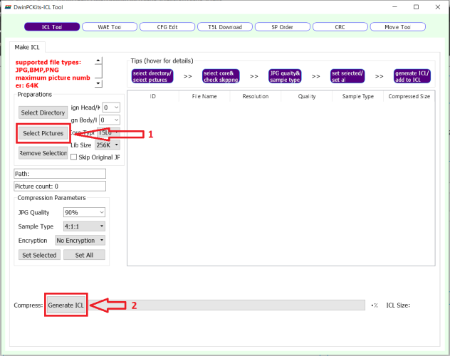 - سپس با استفاده از دکمه Select Pictures تمامی عکس های بک گراند را که در پروژه نیاز دارید اضافه کنید. سپس دکمه Generate ICL را که در پایین صفحه قرار دارد بزنید و مسیر ذخیره فایل را پوشه DWIN_SET انتخاب کنید،نام فایل را 32 بگذارید و دکمه Save را بزنید. تمام تصاویر بصورت یک فایل فشرده در قالب ICL،به نام 32 در پوشه DWIN_SET ذخیره خواهند شد.
