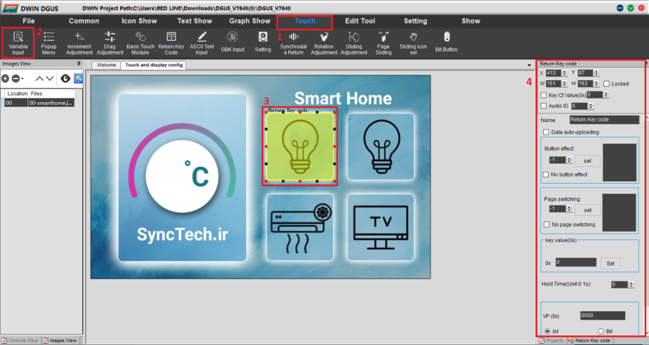 - سپس باید 4 تا button تعریف کنیم که با زدن هریک انها یک دیتا با ادرس و مقدار خاص روی سریال ارسال شود.برای اینکار از منو touch،ابزار variable input را انتخاب کنیم و قسمتی که میخواهیم button تعریف کنیم را انتخاب میکنیم.پس از ان یک بخش جدید سمت راست صفحه نمایش داده میشود که مربوط config کردن ابزار ما است و تنظیمات button را اینجا انجام میدهیم.