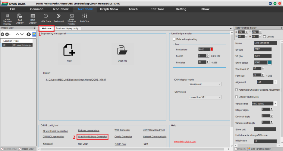 - باید یک فایل فونت ایجاد کنیم تا بتوانیم عدد دما را با فونت دلخواه نمایش دهیم(میتوانید از فایل فونت که قبلا برای شما ایجاد کردم استفاده کنید).برای این کار وارد منو welcom میشویم و در پایین صفحه گزینه Gray word library generator را انتخاب میکنیم.