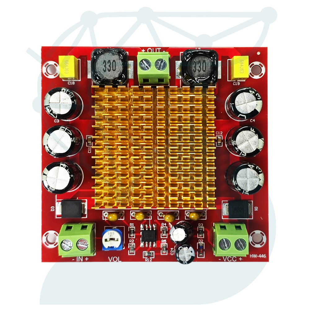 ماژول HW‑446 یک آمپلیفایر صوتی مونو با توان خروجی بالا است که برای تقویت سیگنال صوت و راهاندازی اسپیکرهای پرقدرت در پروژههای صوتی مختلف استفاده میشود. طراحی برد بهصورت فشرده انجام شده اما وجود هیتسینک آلومینیومی بزرگ در مرکز برد، دفع حرارت مناسب در توانهای بالا را ممکن میسازد.
