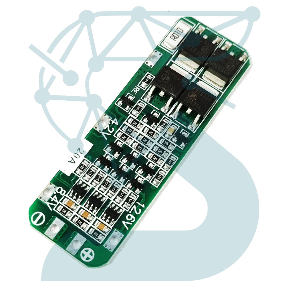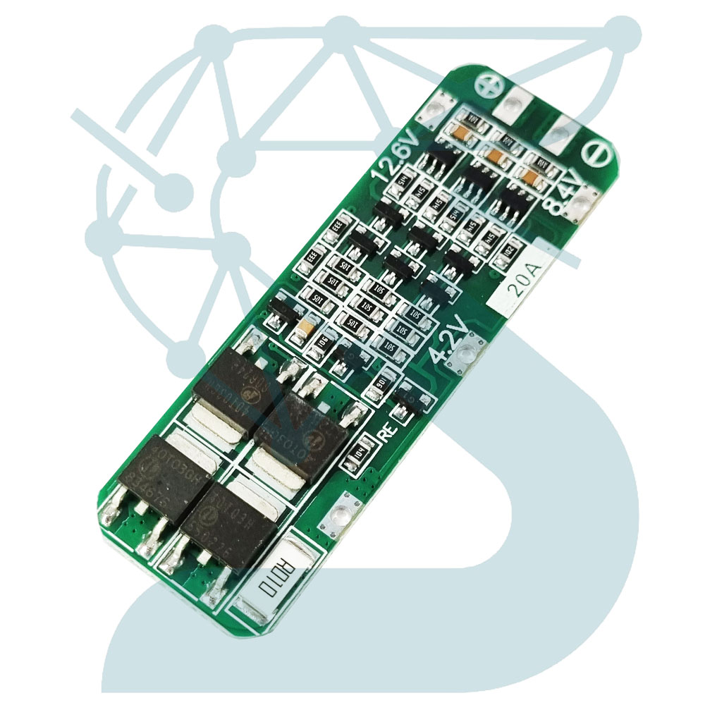 ماژول  3s 20aافزون بر حفاظت‌های پایه نظیر قطع شارژ در ولتاژ بالای هر سلول (حدود 4.25 ولت)، قطع دشارژ زمانی که هر سلول به محدوده زیر 2.75 ولت می‌رسد، حفاظت جریان لحظه‌ای بالا (Over Current Protection) معمولاً در محدوده 20 تا 35 آمپر، و حفاظت قطع سریع در اتصال کوتاه تا جریان‌های 40 آمپر را ارائه می‌دهد. چیپست کنترل مرکزی (رایج‌ترین حالت DW01 یا معادل‌های صنعتی) به همراه دو یا چند ماسفت موازی (با ظرفیت تخلیه و هدایت حرارتی بالا)، علاوه بر حفاظت مستمر، کمترین افت ولتاژ را ممکن می‌سازند تا راندمان سیستم در کاربری‌های حجیم حفظ گردد.
