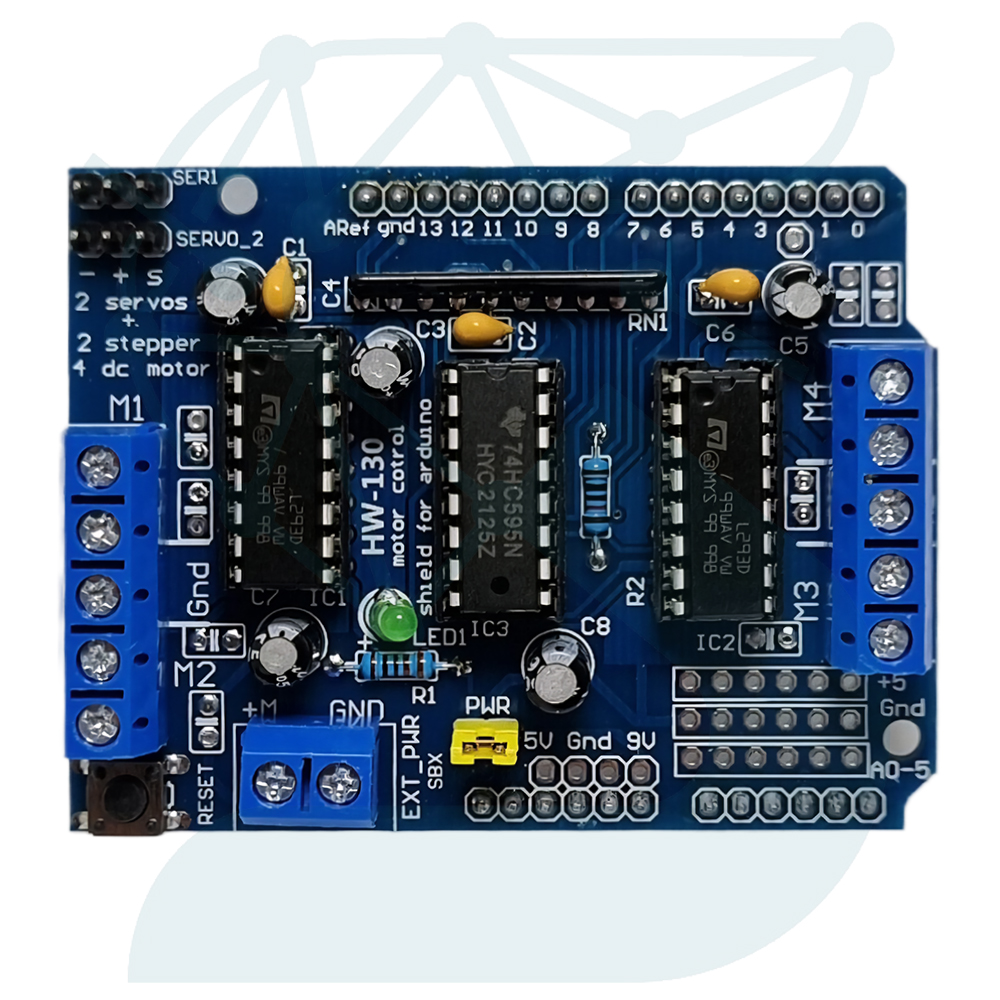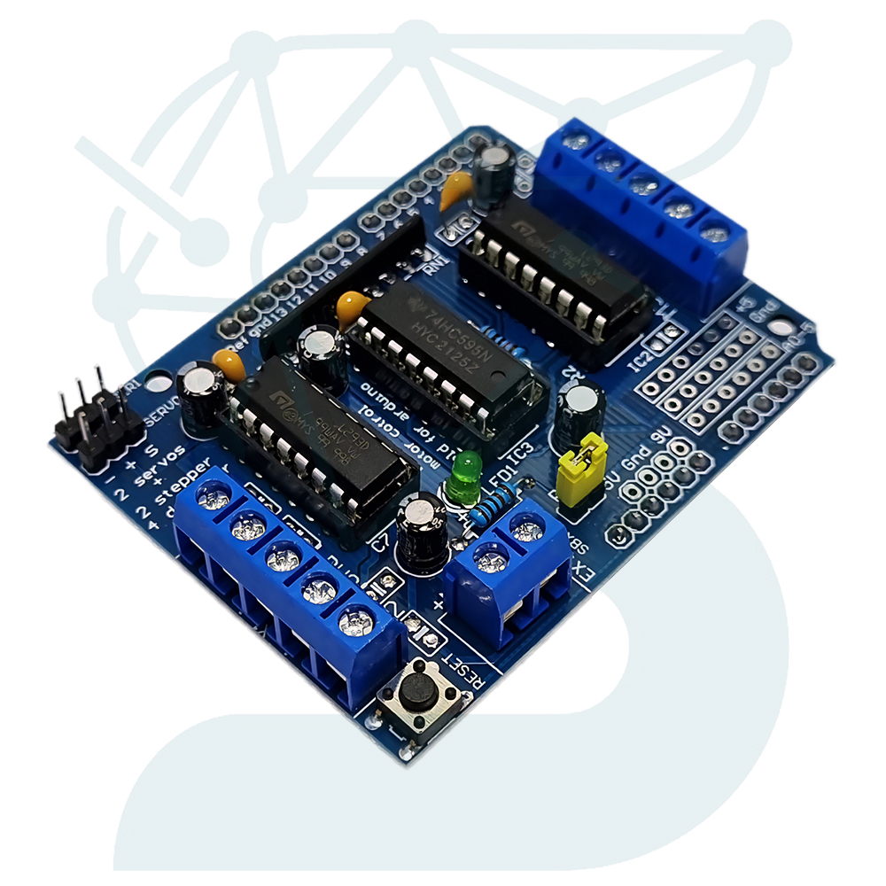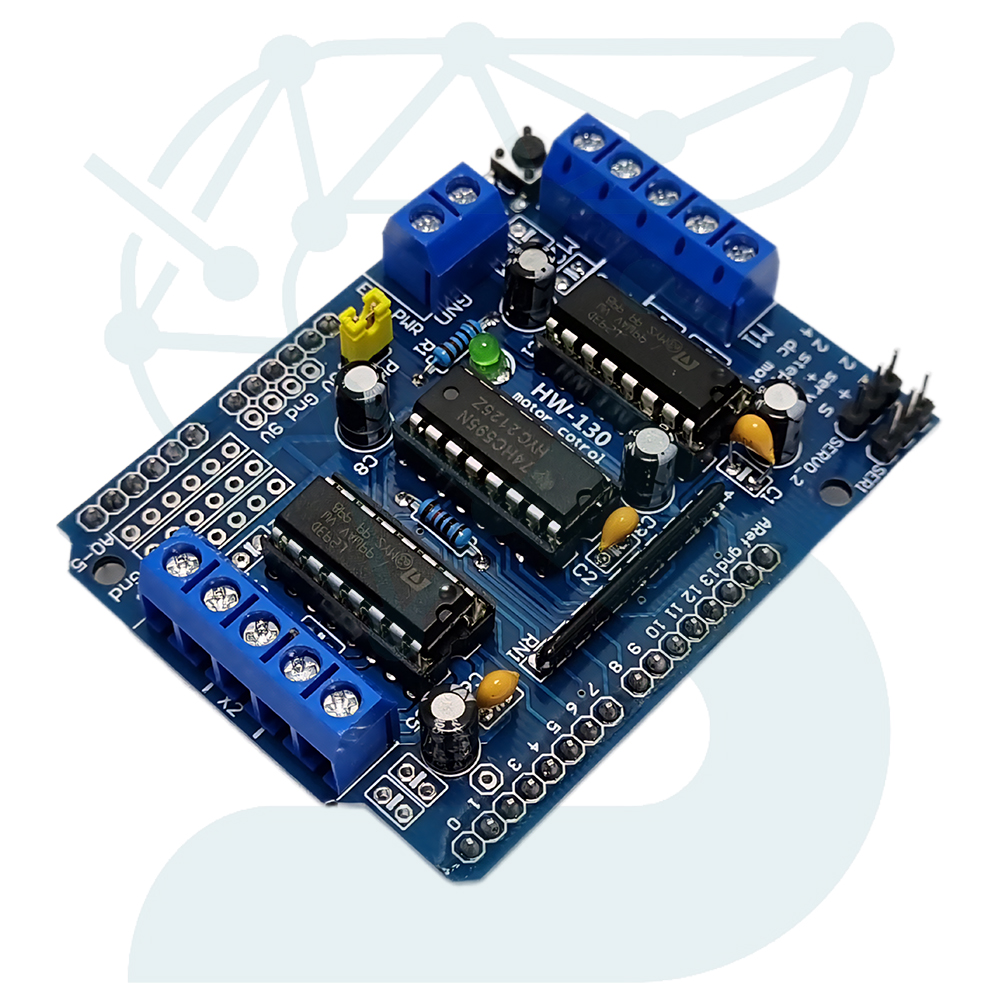 شیلد درایور موتور L293D مخصوص آردوینو یک برد توسعهی کاربردی و استاندارد برای کنترل انواع موتورهای DC، استپر و سروو در پروژههای رباتیک است. این شیلد بر پایهی دو عدد تراشه L293D طراحی شده؛ درایورهایی که هر کدام شامل دو پل H (چهار کانال در مجموع) هستند و امکان کنترل جهت و سرعت موتور را برای کاربر فراهم میکنند.