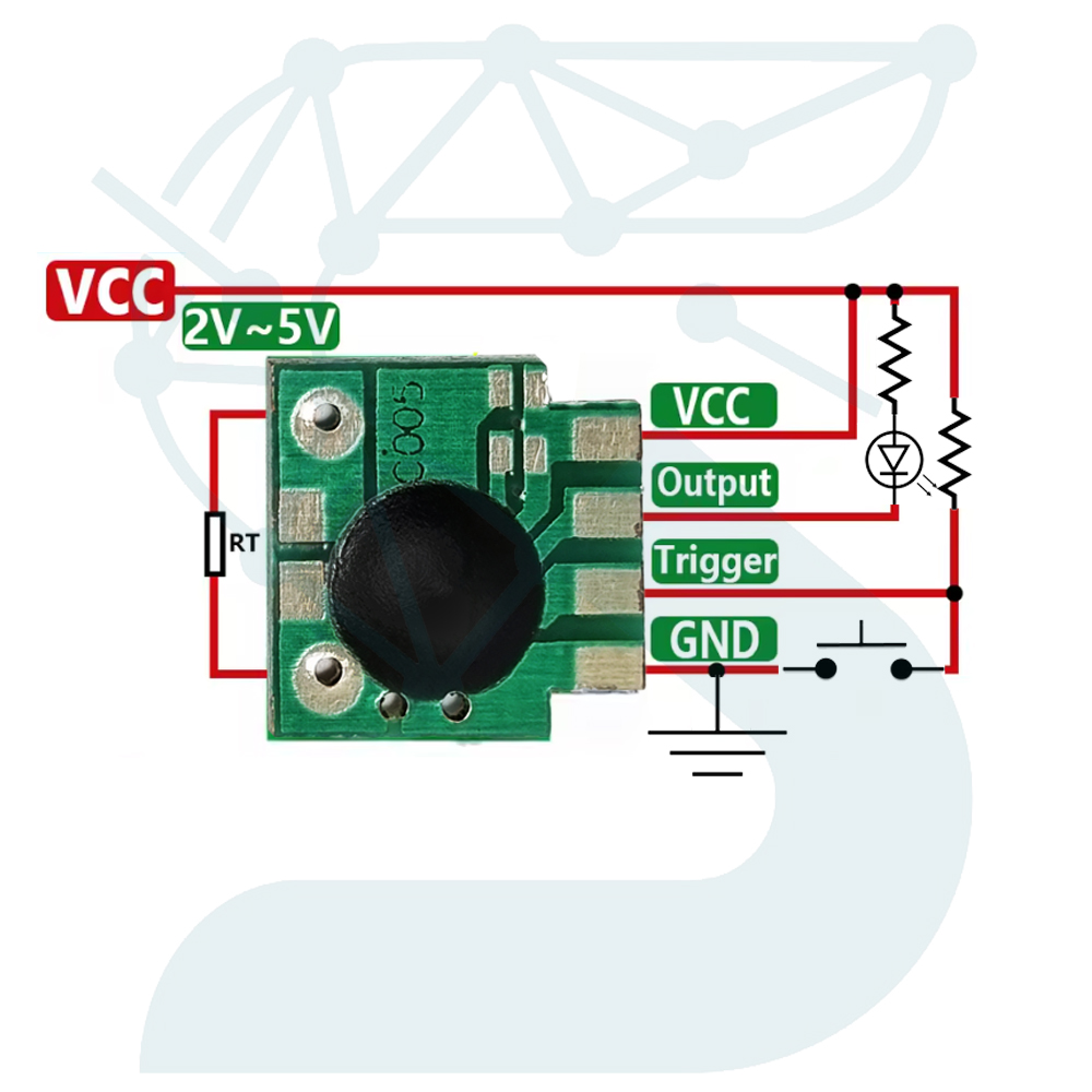 این ماژول از یک تراشه CMOS کممصرف استفاده میکند و با وجود اندازه فوقالعاده کوچک 12mm × 12mm، توانایی ایجاد زمانهای بسیار کوتاه (۲ ثانیه) تا زمانهای بسیار طولانی (۱۰۰۰ ساعت!) را دارد.