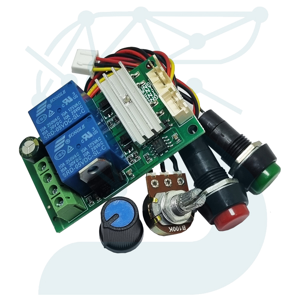 این ماژول یک کنترلر ساده اما کاربردی برای مدیریت سرعت و جهت چرخش موتورهای DC سبک (زیر 3 آمپر) است. طراحی برد شامل یک ولوم برای تنظیم سرعت، دو شستی برای تعیین جهت حرکت (چپ‌گرد و راست‌گرد) و یک واحد قدرت مبتنی بر رله و درایور PWM است. عملکرد ماژول به‌صورت لحظه‌ای است؛ یعنی موتور تنها زمانی می‌چرخد که یکی از شستی‌ها فشار داده شود، و با رها کردن آن، حرکت متوقف می‌شود. این رفتار آن را برای پروژه‌های حرکتی دقیق، کنترل موقعیت خطی و مکانیزم‌های رفت و برگشتی بسیار مناسب می‌کند.