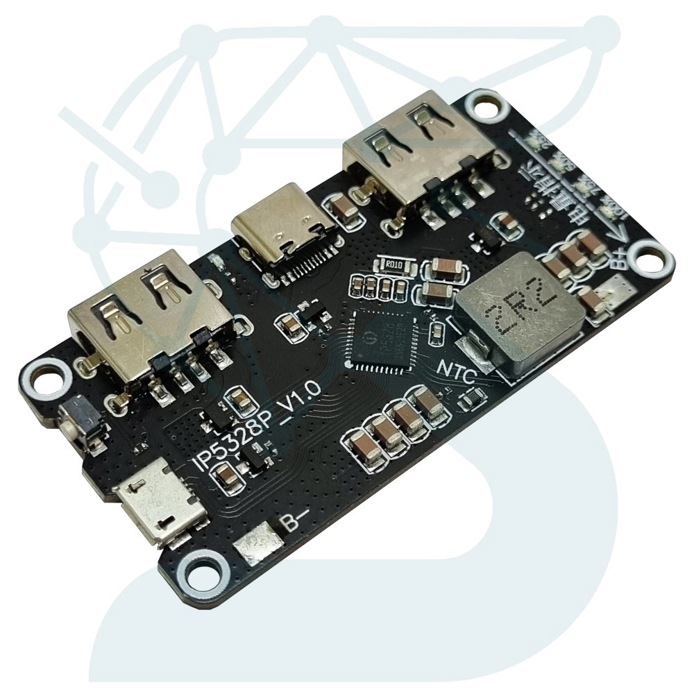 ماژول IP5328P یکی از کامل‌ترین و حرفه‌ای‌ترین بردهای کنترل و شارژ باتری لیتیومی است که مخصوص ساخت پاور بانک‌های فست شارژ طراحی شده است. چیپ اصلی IP5328P در این ماژول وظیفه مدیریت هوشمند شارژ، دشارژ، حفاظت و کنترل توان خروجی را برعهده دارد و می‌تواند با بازدهی بسیار بالا ولتاژهای مختلف را برای خروجی‌های USB تولید کند.