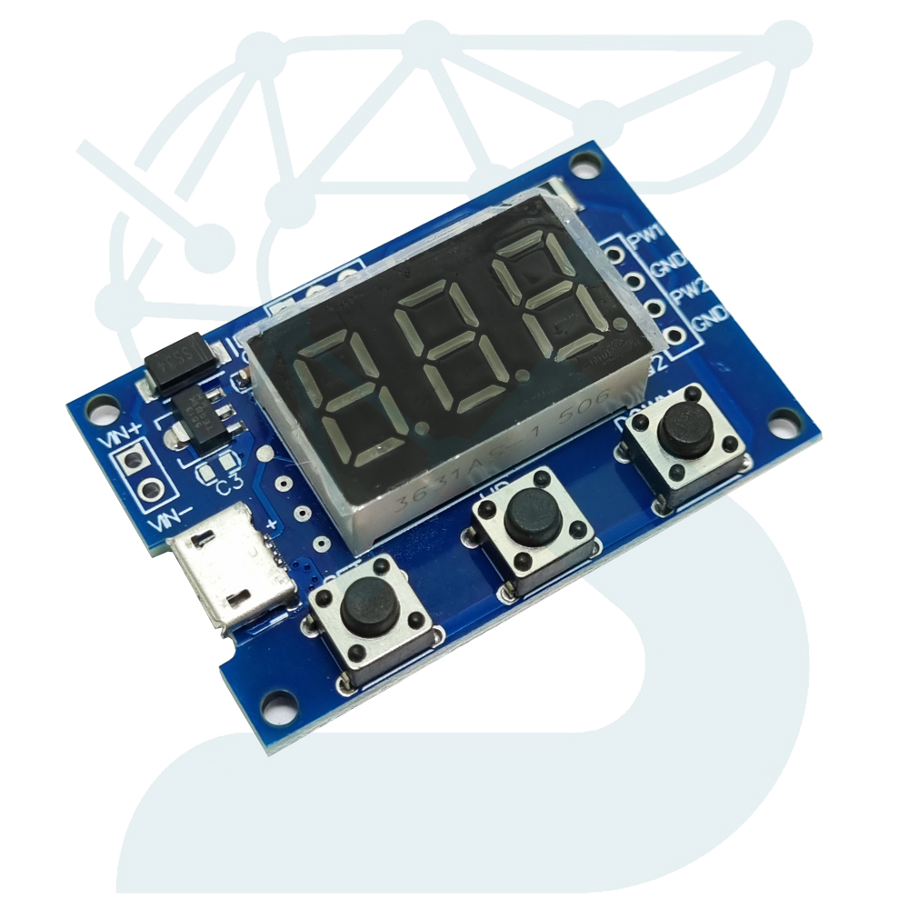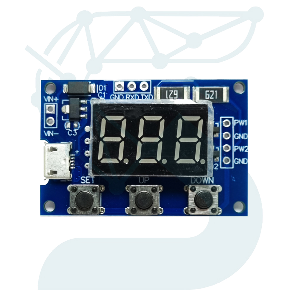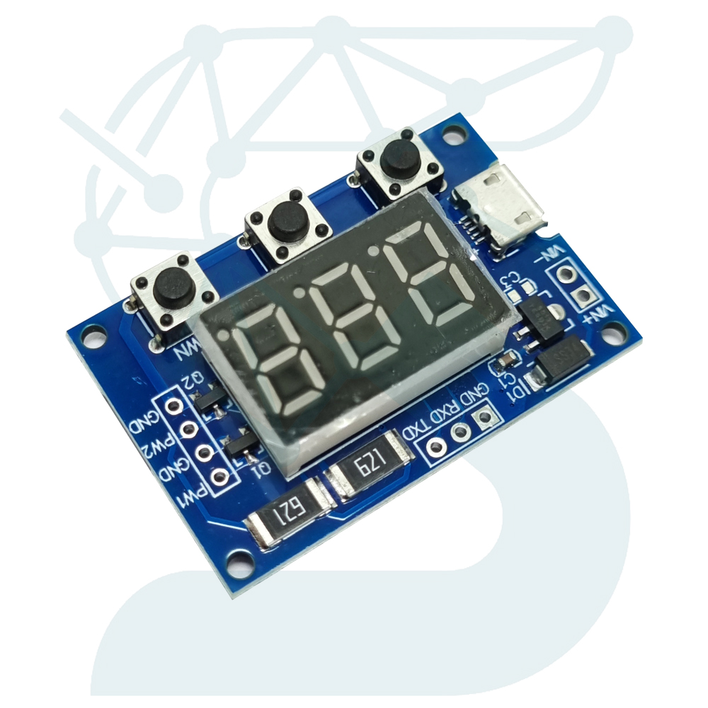 نمایشگر LED سهرقمی روی برد، مقادیر فرکانس و درصد Duty Cycle را نشان میدهد. سه کلید SET، UP و DOWN برای تنظیم سریع پارامترها در نظر گرفته شدهاند. این ماژول قادر است بهصورت همزمان دو خروجی PWM مستقل ایجاد کند.