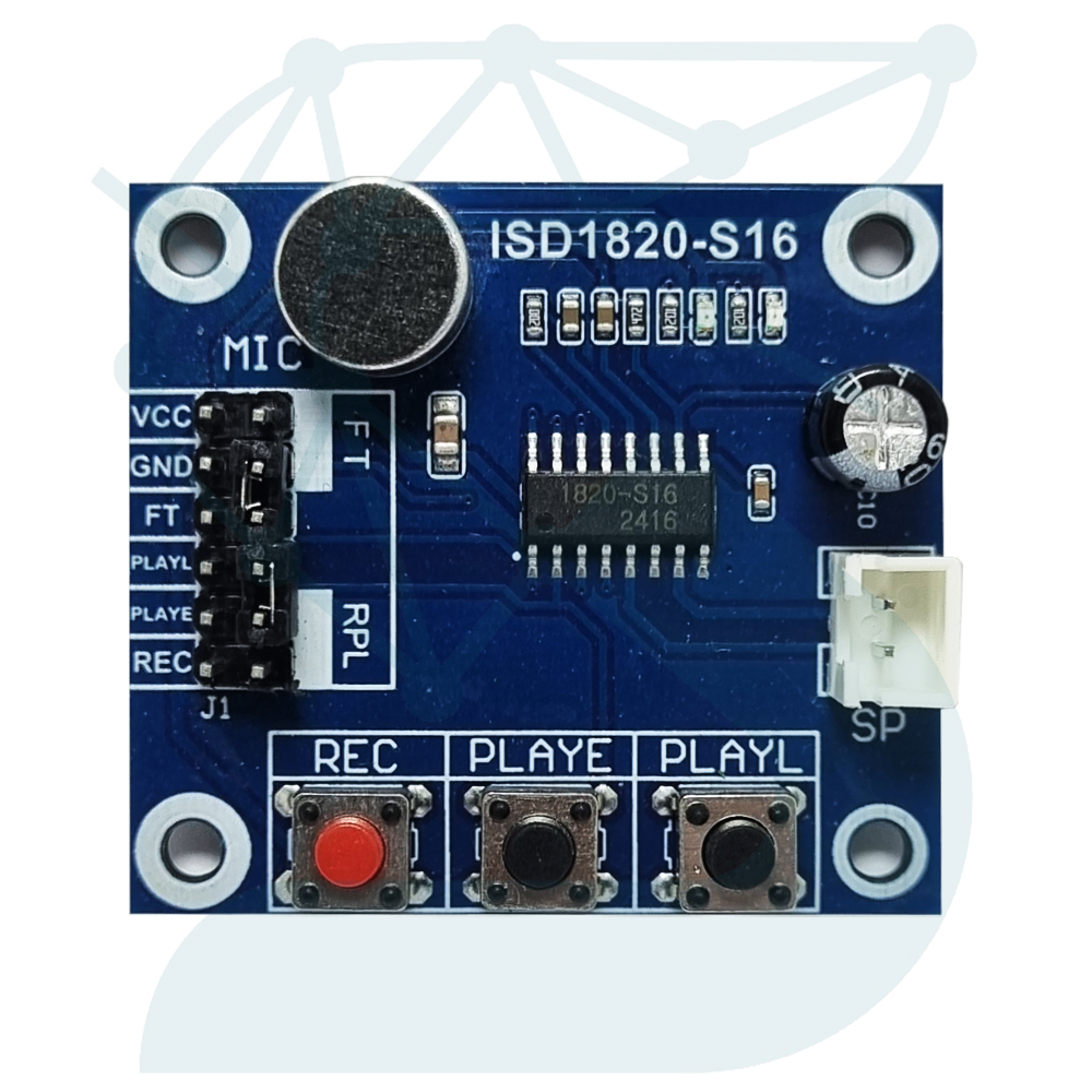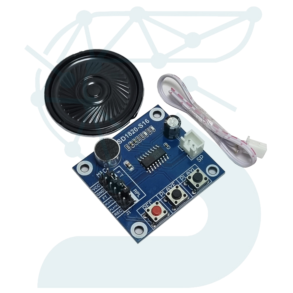 ماژول ISD1820 یک مدار آماده برای ضبط و بازپخش صدای انسان یا هر منبع صوتی با کیفیت مناسب است. این مدل مجهز به میکروفون الکترت، حافظه داخلی فلش و سه دکمهی کاربردی (Record، Play، Repeat) است و با ولتاژ ۳ تا ۵ ولت کار میکند.