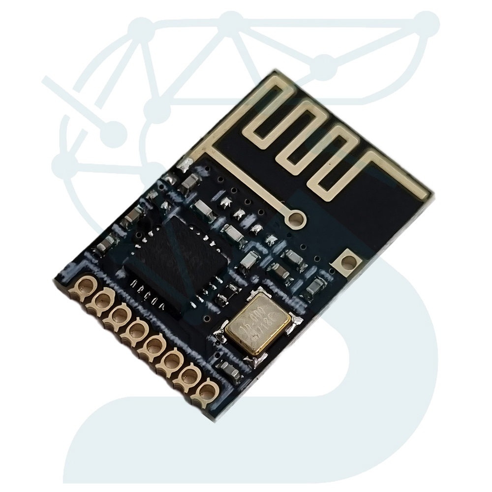 این ماژول مطابق تصویر، نسخه SMD مبتنی بر تراشه Nordic NRF24L01 است که روی یک برد مبدل SMD‑to‑DIP مونتاژ شده تا امکان لحیمکاری آسان و استفاده در بردبرد فراهم شود. طراحی برد شامل آنتن PCB با الگوی meander، کریستال 16MHz دقیق، شبکه خازنهای دکوپلینگ نزدیک تراشه، و مسیرهای RF کوتاه برای بهبود نسبت سیگنال به نویز است. ماژول از معماری Enhanced ShockBurst بهره میبرد که با اعمال Auto‑ACK، Auto‑Retransmit و بستهبندی فریم در سطح سختافزار، بار پردازشی میکروکنترلر را بهطور مؤثر کاهش میدهد. تغذیه و سطوح منطقی کاملاً 3.3 ولت بوده و پایداری تغذیه برای عملکرد صحیح تراشه ضروری است.