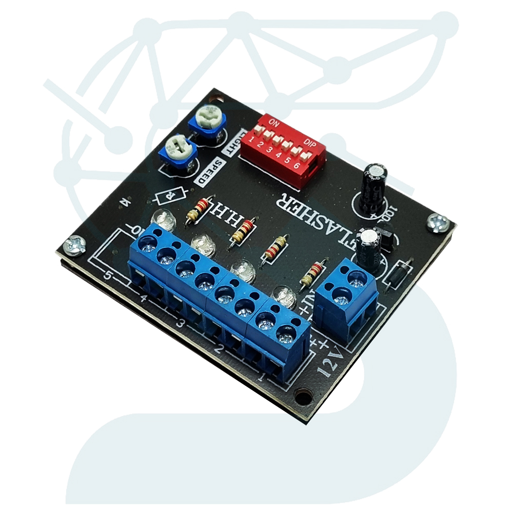 وظیفه انتخاب حالتهای چشمکزن بر عهده DIP‑Switch ششتایی است. کاربر با ترکیب وضعیت این کلیدها میتواند افکتهای مختلفی مثل چشمک همزمان، چرخشی، پلیسی، جفتی یا الگوهای ترکیبی را انتخاب کند.
