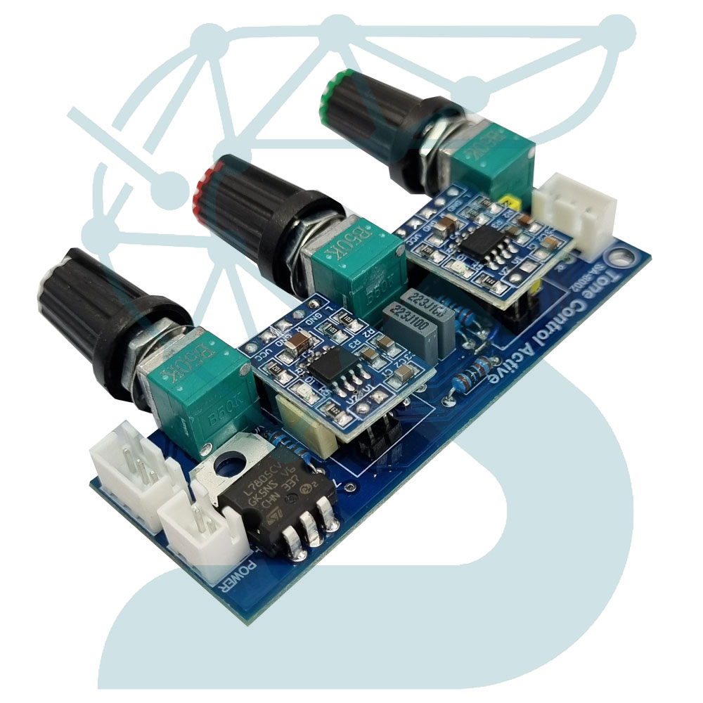 یکی از ویژگیهای اصلی این ماژول وجود مدار تن کنترل اکتیو است که کاربران را قادر میسازد با استفاده از پتانسیومترهای تعبیهشده بر روی برد، فرکانسهای بیس (Bass) و تریبل (Treble) و حجم صدا را به دلخواه تنظیم کنند. این قابلیت باعث میشود صدای خروجی بر اساس سلیقه و نوع کاربری، قابل شخصیسازی باشد.